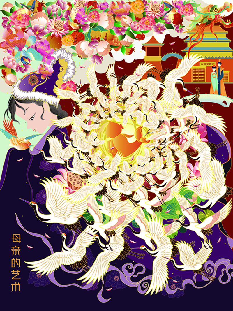 “母亲的艺术”系列海报设计作品既有西秦民间刺绣的艺术特色,又有现代设计的美学特色,在设计上采用插画艺术的写实风格,表现为充满活力的老虎、栩栩如生的龙凤呈祥、娇艳绽放的荷花、自由自在的小鱼、可爱灵动的小鸟、活波机灵的孩童和温柔慈祥的母亲等主体纹饰。主体画面在去除了冗余的,稚剪的和繁杂的辅助元素之后,留下极具代表西秦民间刺绣艺术特征的轮廓,对其艺术特征进行要点提取同时在设计上更加强调了夸张化和符号化...