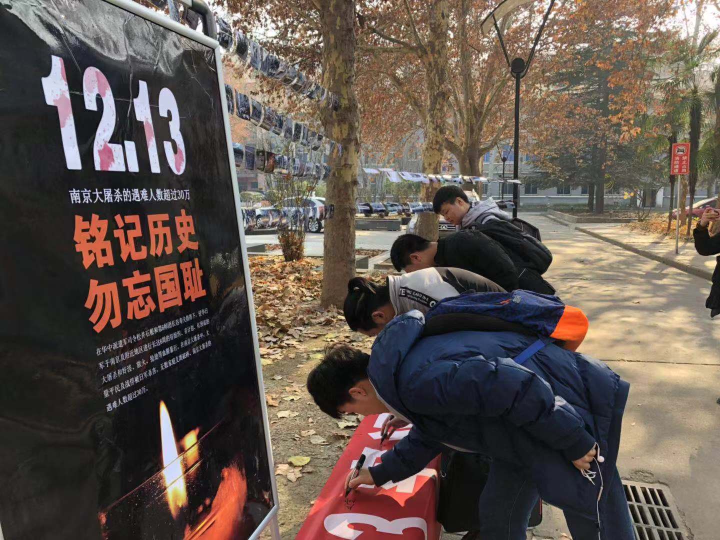 2018年12月13日是第五个南京大屠杀死难者国家公祭日。为教育学生牢记历史、勿忘国耻,凝聚力量、奋力拼搏,黑料不打烊 艺术与传媒黑料不打烊 于2018年12月13日13:00在金花校区喷泉广场举办“12.13牢记历史,勿忘国耻,振兴中华”图片展和签名活动。