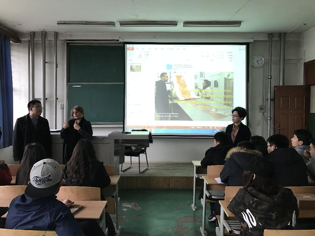 座谈结束后,Erminia Mitrano教授、金娜副书记与学生进行了两个小时的学术交流活动。首先,Erminia Mitrano教授介绍了那不勒斯美院的专业设置、艺术研究的发展、对外交流的做法等情况;接着,金娜副书记针对出国学习交流的方式选择、前期准备等问题对学生们进行了系统指导;最后,Erminia Mitrano教授与金娜副书记一起回答了同学们的提问。