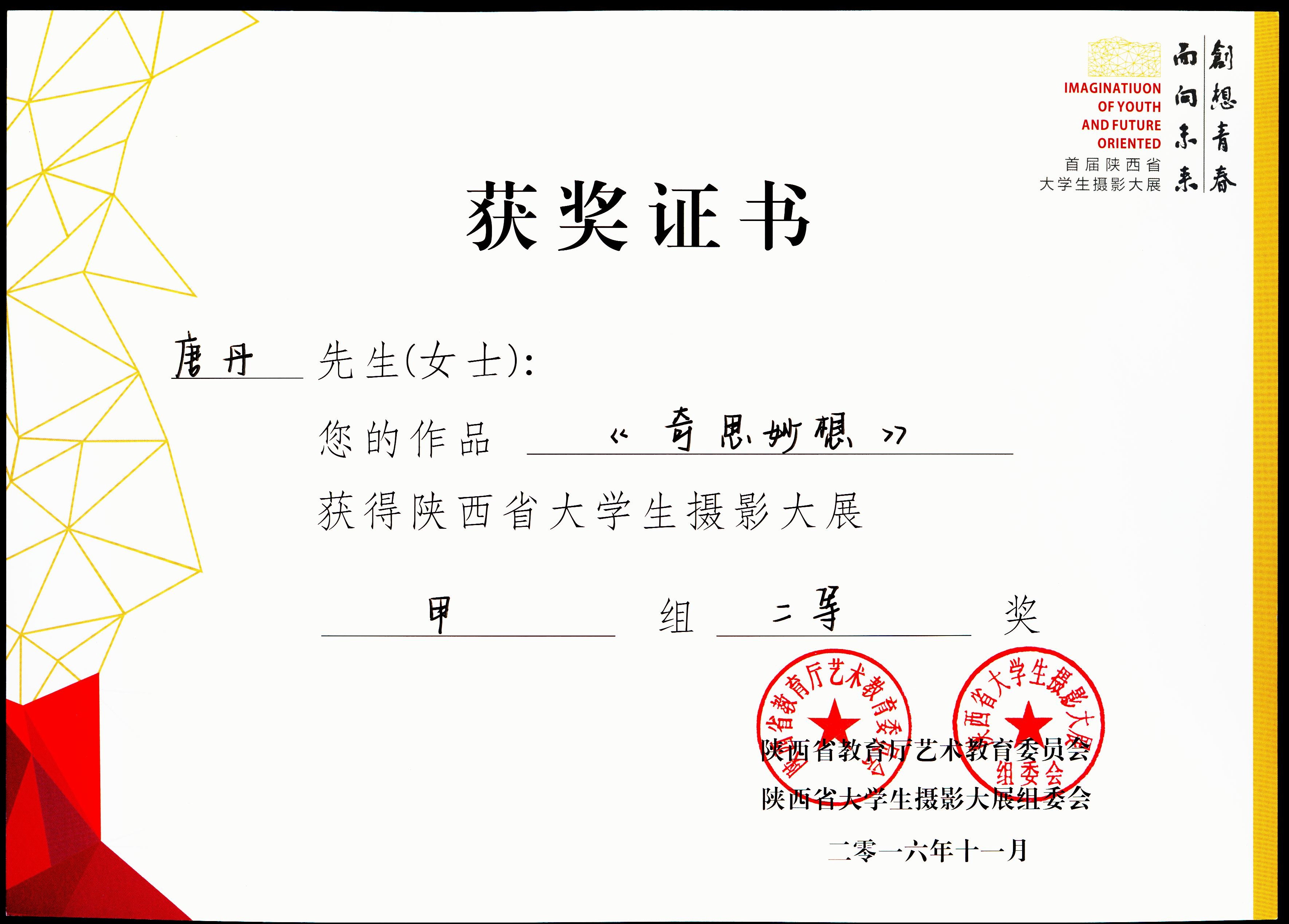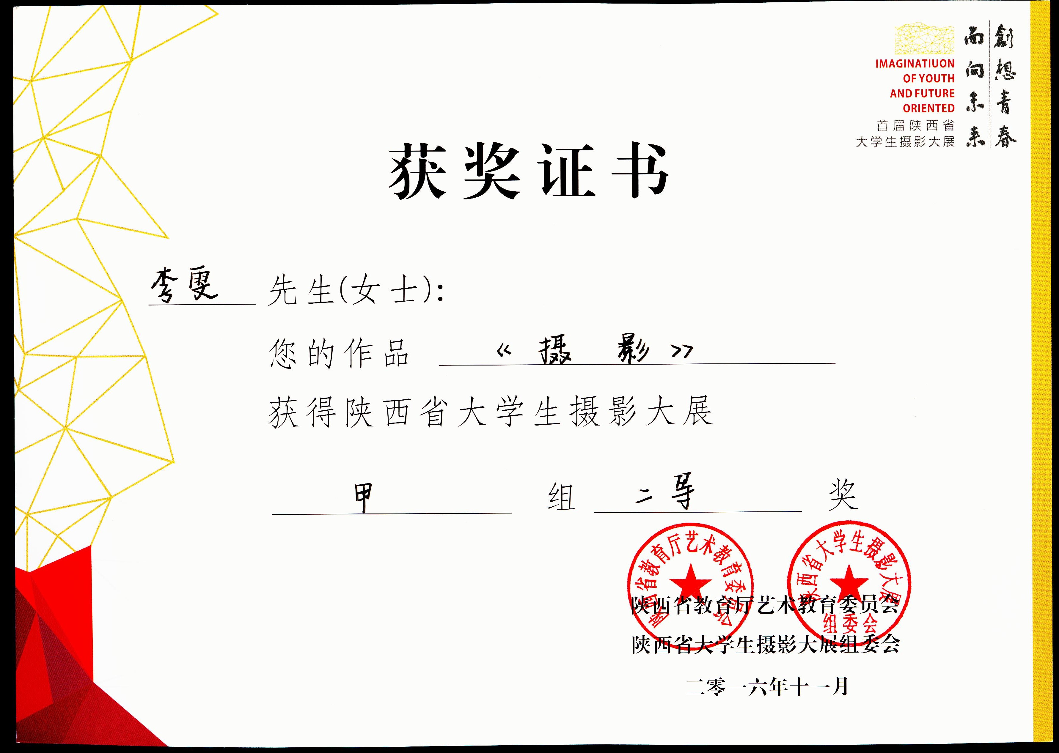 张耘老师、洪涛老师、高有宏老师、赵海龙老师指导下,学生们获得了优异的成绩。由陕西省教育厅主办的首届陕西省大学生摄影大赛以“创想青春、面向未来”为主题,展现当代大学生朝气蓬勃的艺术创作风貌、以推动祖国文艺繁荣为目标、追求向真、向善、向美的校园文化;体现我省大学生对中华民族文化创造力的骄傲,对中华文化繁荣兴盛的自信;展示青年学子高尚的审美情趣和优秀的艺术才华。本次大赛共收到我省50所高校学生作品参加,作品数量达13163副,经教育厅摄影大赛组委会评审,从参赛作品中评选出各类获奖作品330 幅,分甲组、乙组和“我眼中的西安”摄影单元,评选出高校优秀组织奖15个。