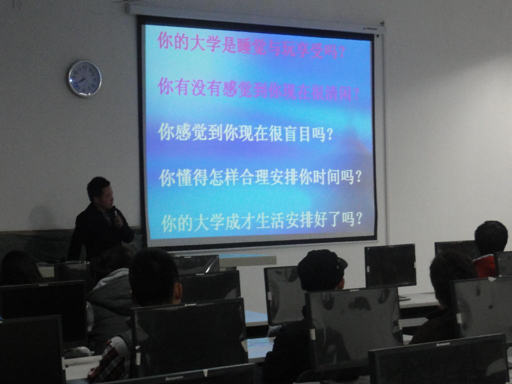 黄老师首先向同学们阐述了自己是如何从一名贫困生到自主创业、发家致富的过程。接着,黄老师以自己的人生经历向大家提出了“四步走”的大学规划:坚守自身品格、做到自立自强;把握生活中每一次机会;多读书、读好书,积极拓宽自身知识面和深度;多参加社会活动,建立好人际关系的同时又锻炼了自身的能力。最后,黄老师殷切希望同学们要爱国爱校,以实际行动来回报学校的关心和培养,并寄语同学们:命运是早已注定的,但生活是自己创造的。