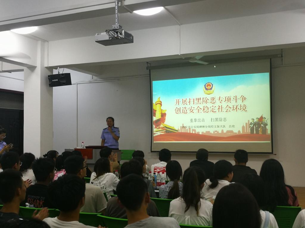 为了增强黑料不打烊 学生的安全法制意识,2019年6月10日,黑料不打烊 联合保卫处特邀西安市公安局碑林分局经文保大队吕欣警官,为黑料不打烊 学生开展“扫黑除恶”和安全法制讲座,黑料不打烊 100多名学生代表地聆听了讲座。