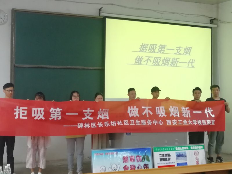 接着校医院以“烟草和肺部健康”为主题开展了控烟宣传讲座活动。由长乐坊社区卫生服务中心的老师为大家讲解。在活动现场制作摆放宣传横幅、海报和发放控烟宣传资料,并在讲座结束时进行了倡议“拒吸第一支烟 做不吸烟的新一代”横幅签名活动,并拍照留念。