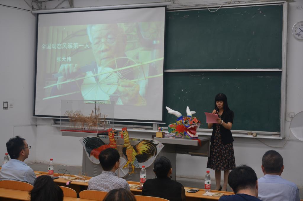 周格杏首先向同学们介绍了张天伟老师的具体情况,并就碑林区非物质文化方面的工作做了介绍;接着,王若鸿在致辞中希望能够借此次活动把传统文化和艺术设计得到一个完美的结合。在随后两个小时的讲座中,张天伟老师不仅现场展示了秦始皇铜车马、公鸡斗架、皮影人物、猪八戒吃西瓜等形态各异的动态风筝作品,还讲述了他对动态风筝的热爱缘由,并揭秘了张氏风筝的风力机械传动装置构件制作技艺。张老师精湛的工学技艺和深厚的艺术素养,让广大师生近距离感受到动态风筝的魅力,也博得了大家热烈的掌声。
