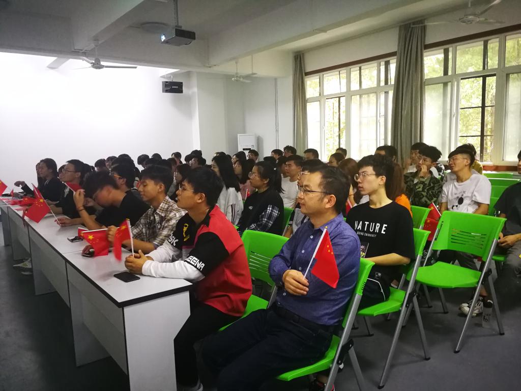 直播开始前,全体师生起立共唱《今天是你的生日,我的中国》,为祖国母亲送上最美好的生日祝福,伴随着庄严肃穆的国歌声,五星红旗冉冉升起,全体师生起立行注目礼。接着,习近平总书记检阅阅兵方阵并发表重要讲话,他指出:今天,社会主义中国巍然屹立在世界东方,没有任何力量能够撼动我们伟大祖国的地位,没有任何力量能够阻挡中国人民和中华民族的前进步伐。全体师生倍感振奋,自发的报以雷鸣般的掌声。一个个独步方阵和高精尖的武器装备方阵毫秒不差的依次通过天安门广场接受党和人民的检阅,群众游行队伍带领我们回顾了党带领人民走过的辉煌70年,师生们热血沸腾,掌声和欢呼声此起彼伏。