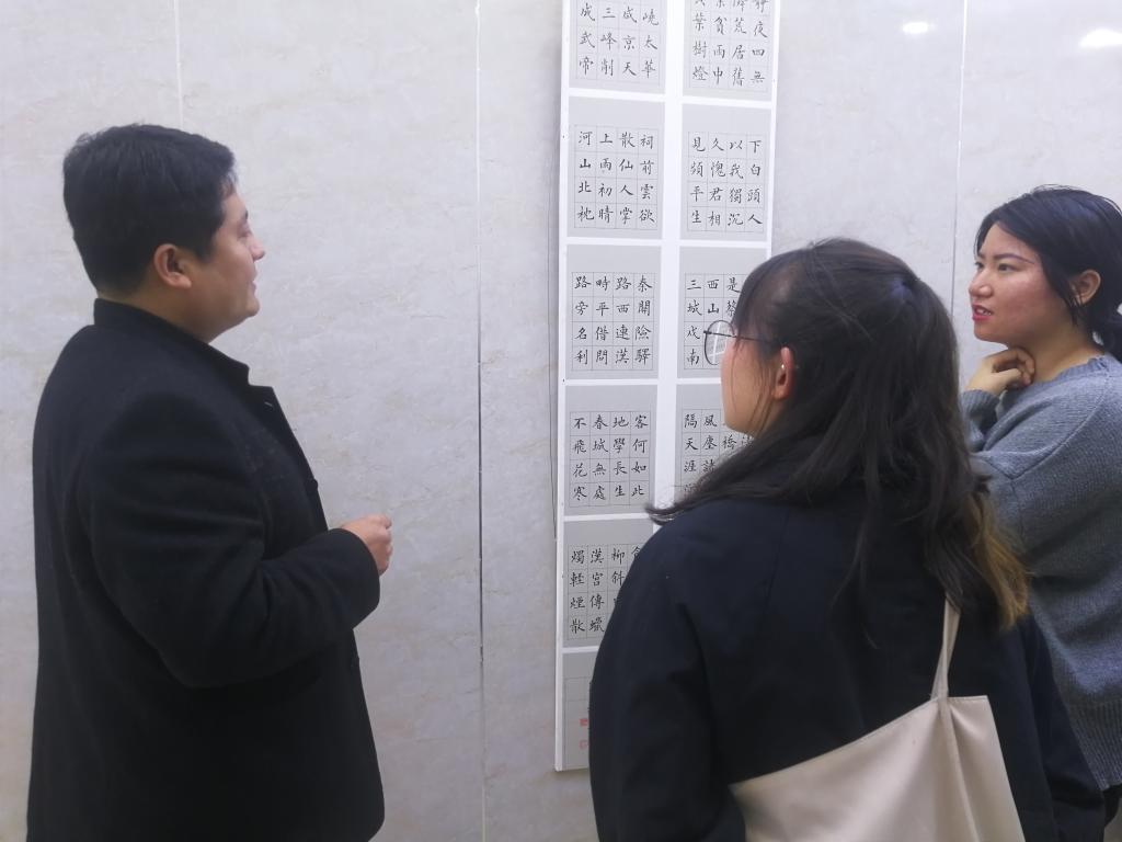 牛老师在现场就书法结构、章法等专业方面的知识为大家进行了详细的讲解,同学们认真聆听着,并记录在自己的工作本中;参观完作品展后,大家统一在会议室进行了座谈研讨,就书法社今后的课程安排、详细的用品清单进行了具体的说明,就今后作业的数量、质量、要求及各类研讨训练方面进行了深入的沟通交流,研讨会现场气氛热烈,同学们热情高涨,虽然都是非书法专业学生,但是他们对于书法的热衷程度不亚于书法专业学生,学生们纷纷表示,会在牛老师的指导下勤奋练习,力争早日取得进步。