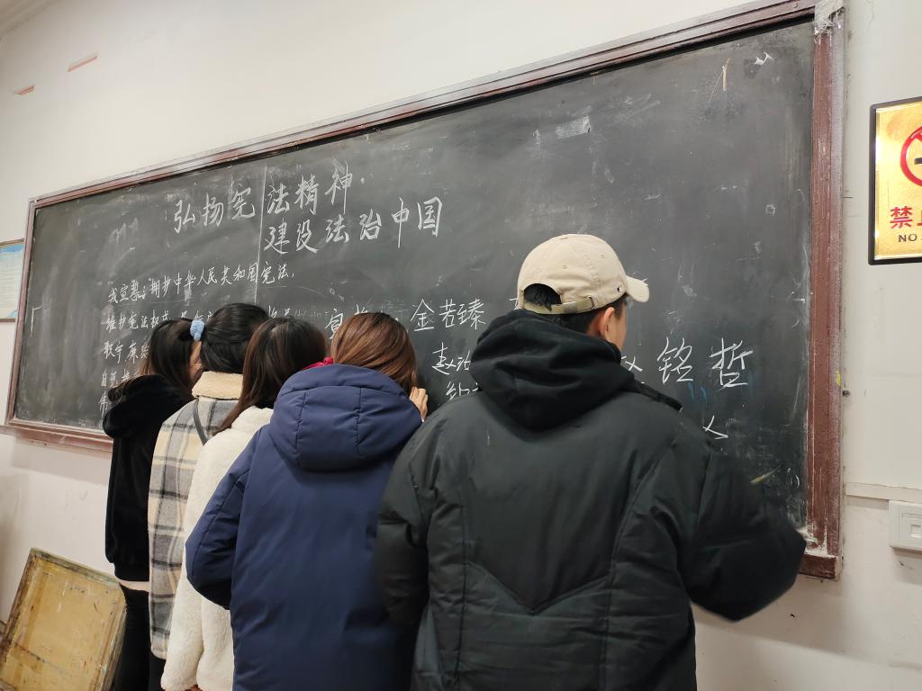 活动中,同学们以多种形式开展学习活动,对宪法日设立意义、《中华人民共和国宪法》的内容以及2018年宪法修改内容等方面进行一一学习,同学们认真学习宣讲内容,同学们学习之后纷纷在黑板签名,更加认识到我国依法治国的理念以及坚定作为学生遵纪守法的思想。