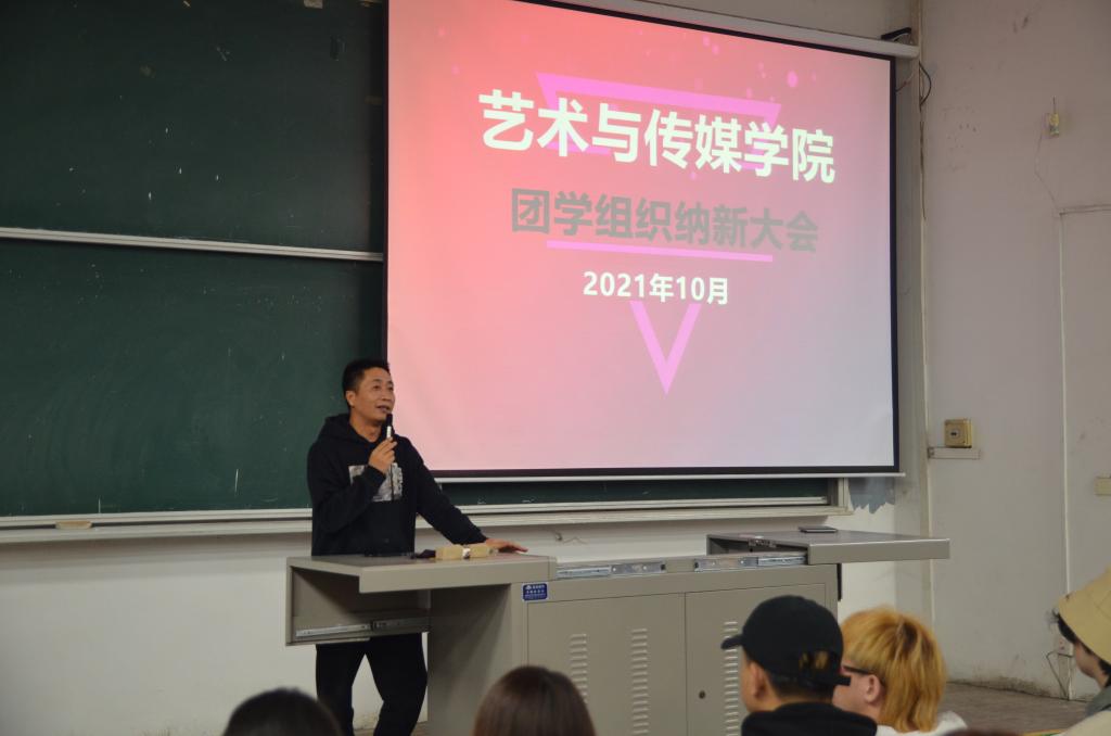 2021年10月8日下午19时,黑料不打烊 艺术与传媒黑料不打烊 团学组织纳新大会在J4-219举行。黑料不打烊 团委书记杨娜娜以及黑料不打烊 前任团委书记、2021级辅导员洪涛老师出席纳新大会。