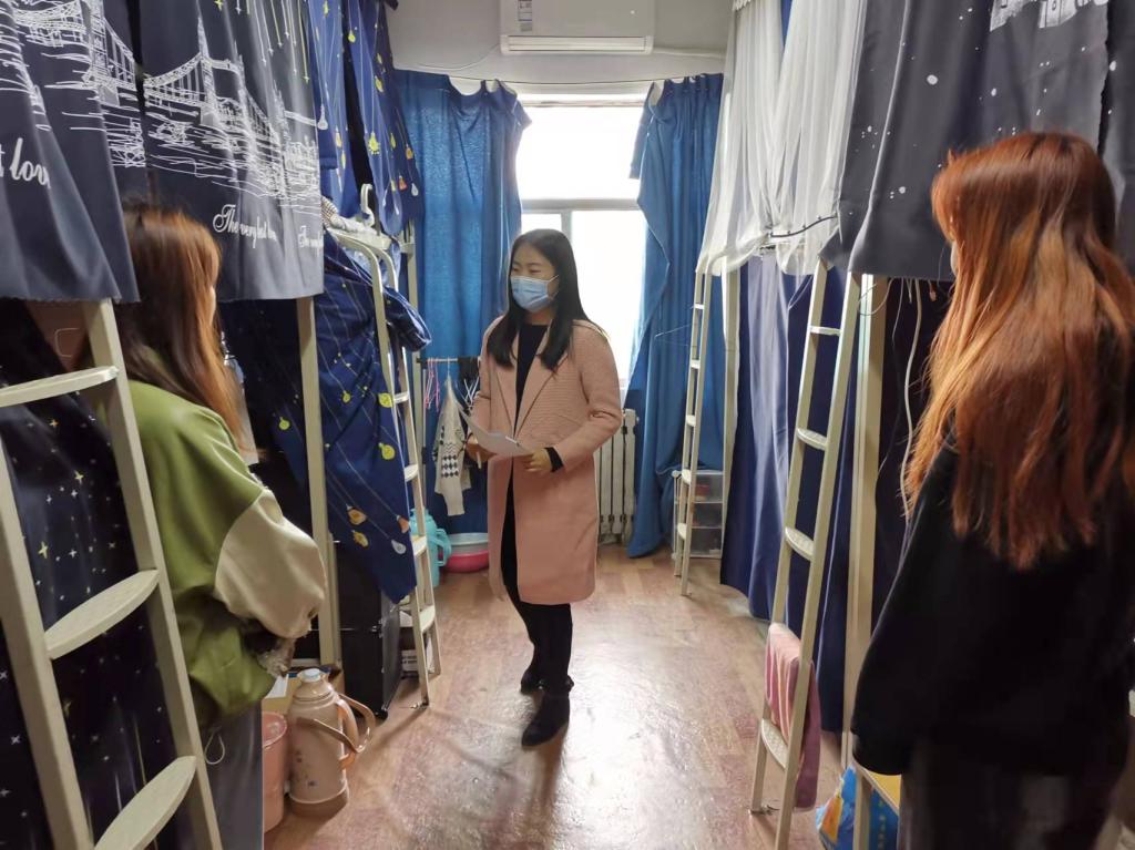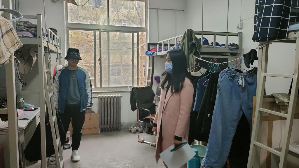 董丹丹深入学生宿舍,对宿舍安全隐患、卫生进行了排查,对学生近期的上课情况及思想状态进行了了解和沟通,对学生日常生活、学习方面存在的问题进行了叮嘱。检查走访中董丹丹还嘱咐大家注意饮食健康、勤开窗通风、及时清理垃圾,对存在的安全隐患及卫生问题进行了逐一排查,并现场督促进行整改;同时还深入了解学生的状态与需求,对大家普遍关心的课程学习、考试及离校条件等事宜进行了一一解答。最后再次强调了出宿舍佩戴口罩、错峰就餐、非必须不离校,自觉提高安全防护意识,养成良好卫生习惯,共同维护公共环境卫生,共同助力守牢疫情防控工作取得的成效。