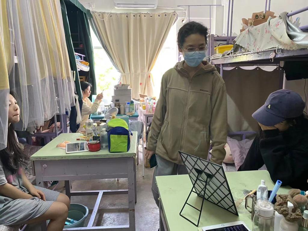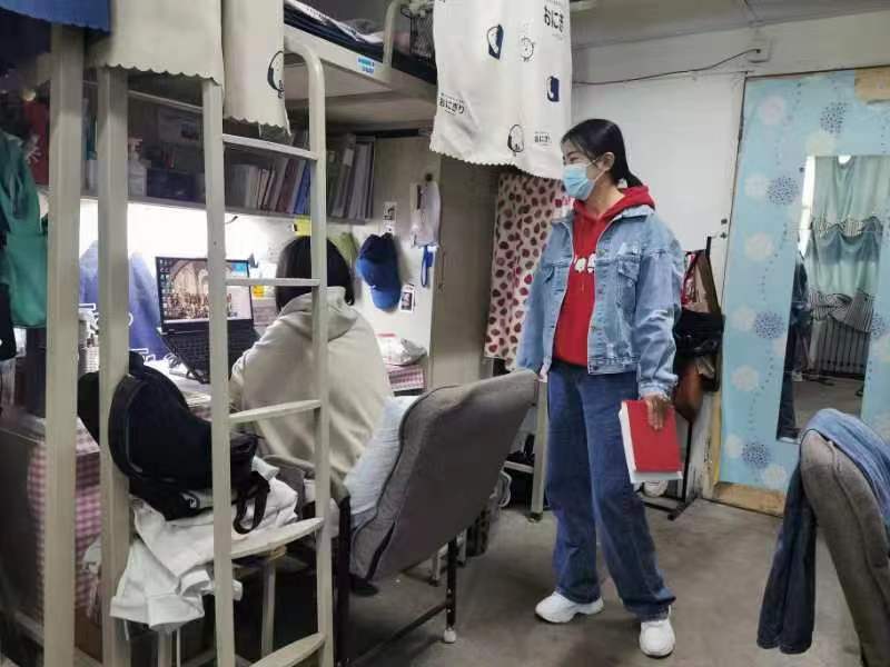张晓宾和各年级辅导员深入学生宿舍,详细了解了疫情防控期间学生线上学习、宿舍生活状况,现场解答了学生们的问题。同时向同学们介绍了学校封闭管理的相关情况,叮嘱大家按时晨午检打卡,暂停外卖及网购,每天保持寝室清洁卫生,多通风、勤倒垃圾,做好相关消杀工作。对学生宿舍存在的安全隐患进行了逐一排查,并现场督促进行整改。