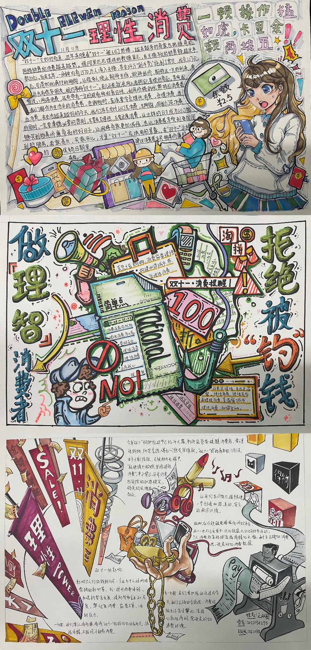 比赛共收到113份手抄报作品,同学们将自己对理性消费不同的的认识及如何树立正确的消费观等理解融入手抄报作品中,呼吁大家要杜绝攀比心理,不炫耀,不从众,减少不必要的开支,在自己所能承受的范围内适度消费;要树立正确的消费观,养成科学合理的消费习惯;购买物品前,要三思,克制过分的消费欲望,购买生活必需品。