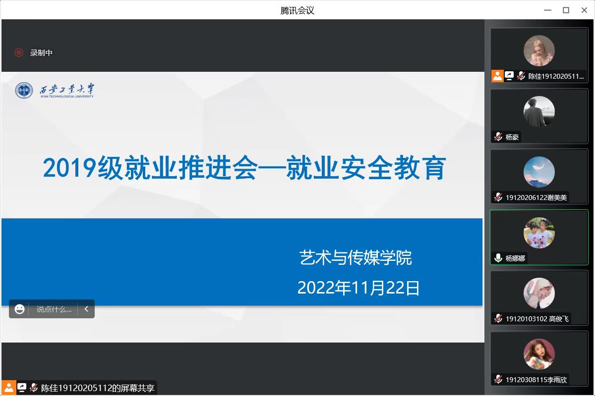 毕业生的就业安全意识,教育引导毕业生树立正确就业观,构建平安和谐校园,11月22日中午12:00,2019级通过腾讯会议召开就业推进会—就业安全教育,会议由2019级辅导员杨娜娜主持,2019级毕业班全体学生参加。