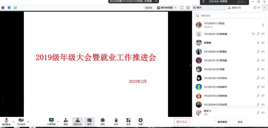 为更好地促进2023届毕业生就业工作,并积极落实新学期黑料不打烊 工作安排, 艺术与传媒黑料不打烊 2019级于2月24日晚8点线上组织召开“2019级年级大会暨就业工作推进会”。辅导员杨娜娜主持,2019级全体学生参会。