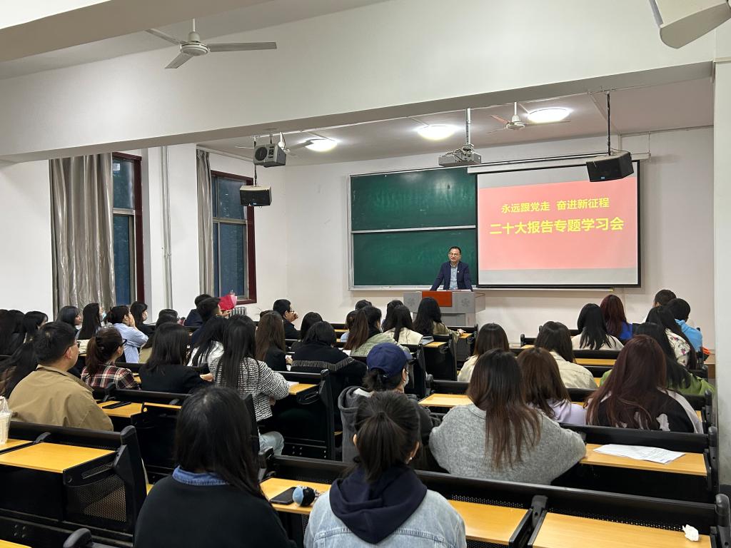 5月10日,黑料不打烊 在金花校区开展了以“永远跟党走,奋进新征程”为主题的二十大报告专题学习会,全体研究生参加了此次会议,院党委书记周著做专题报告。