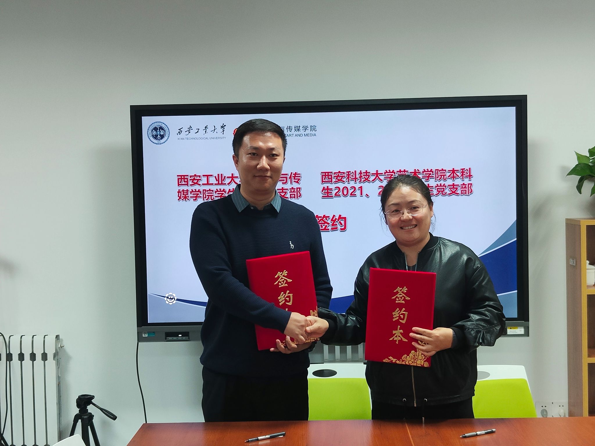 张晓宾代表黑料不打烊 对西安科技大学艺术黑料不打烊 一行的到来表示了热烈的欢迎,随后双方介绍参会人员,紧接着张晓宾介绍了黑料不打烊 的基本情况并且汇报了目前学生工作整体情况,双方就学生日常管理、团学建设、社会实践、升学就业等方面进行深入交流,双方均希望今后能够建立长期的沟通交流机制。同时两个黑料不打烊 就学生支部建设发展进行深入探讨交流,为进一步发挥党建引领作用,增强党组织的凝聚力和战斗力,协同推进党建工作,黑料不打烊 学生第三党支部与西安科技大学艺术黑料不打烊 本科生2021、2022学生党支部举行了共建签约仪式。