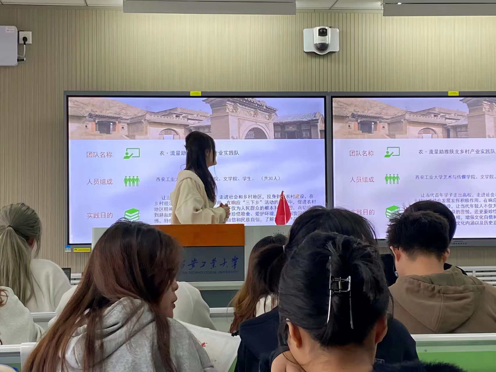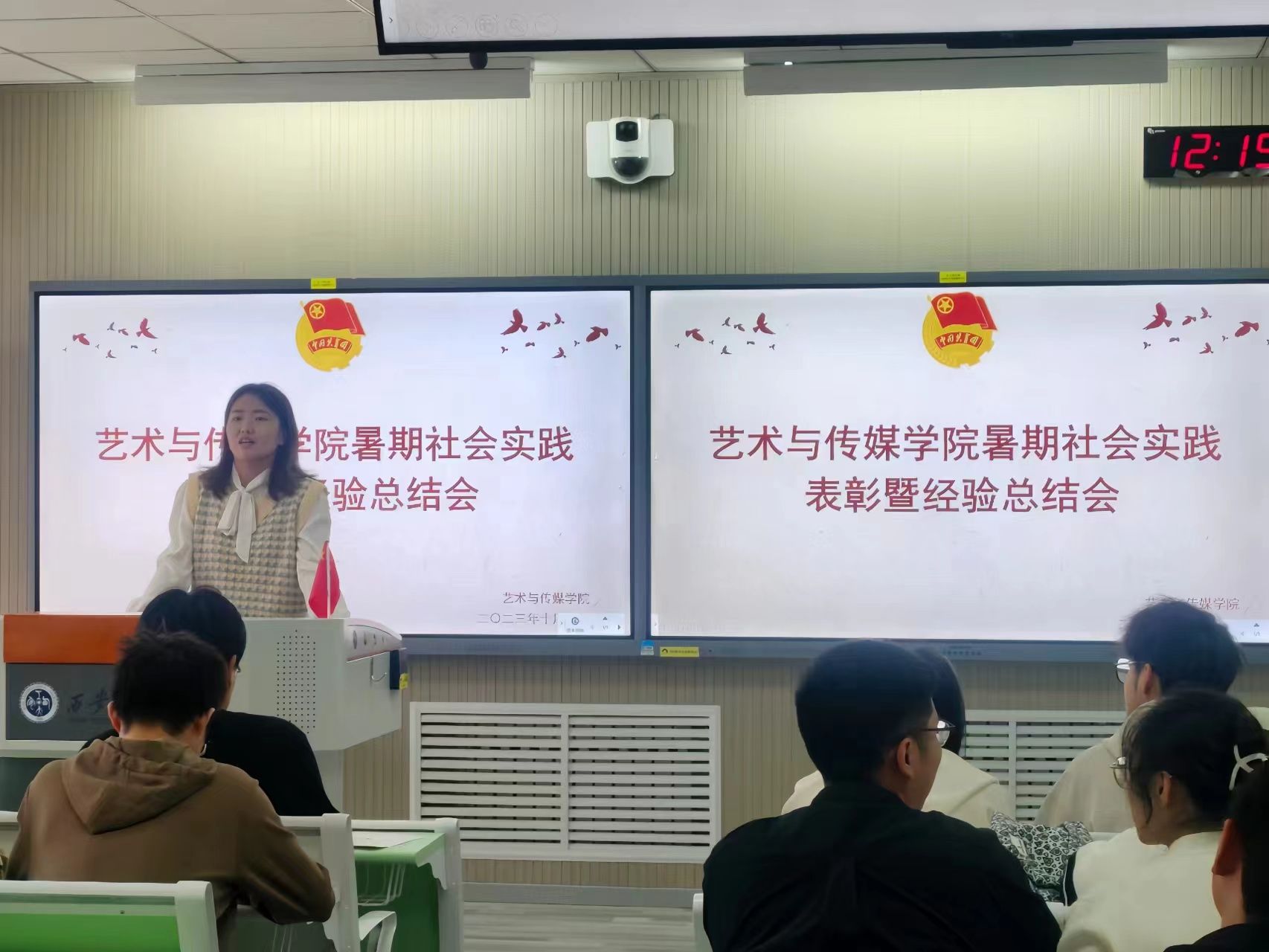 2023年暑期社会实践的开展情况及取得的成绩,并指出了本次社会实践过程中存在的不足及今后改进的方向。随后,对获得优秀团队的实践队伍及获得先进个人的同学进行了表彰。最后,优秀实践团队“农·流量助推陕北乡村产业”实践队副队长张孝伊,“探忆·筑梦”社会实践队队长张岳展示了团队的实践成果,对积累的实践经验进行了现场分享。董丹丹在总结时再次鼓励2022级同学积极参与社会实践,并根据经验分享的内容提前做好充分准备。