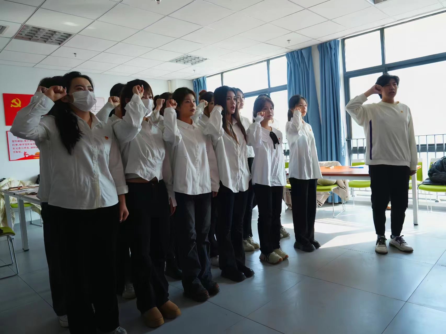 入团仪式在庄严的国歌声中隆重拉开帷幕。首先由董丹丹宣读新发展团员名单并对新入团的共青团员表示祝贺,她表示,希望全体团员青年时刻以一名共青团员的标准严格要求自己。随后,领誓人张绍洋带领大家进行入团宣誓,全体新老团员高举右拳,以饱满的精神面貌向团组织坚定表明为共产主义事业而奋斗的理想信念。最后,杨馥亦代表老团员发言并向新发展团员们发出坚定信念,增长才干,贡献青春力量的倡议。