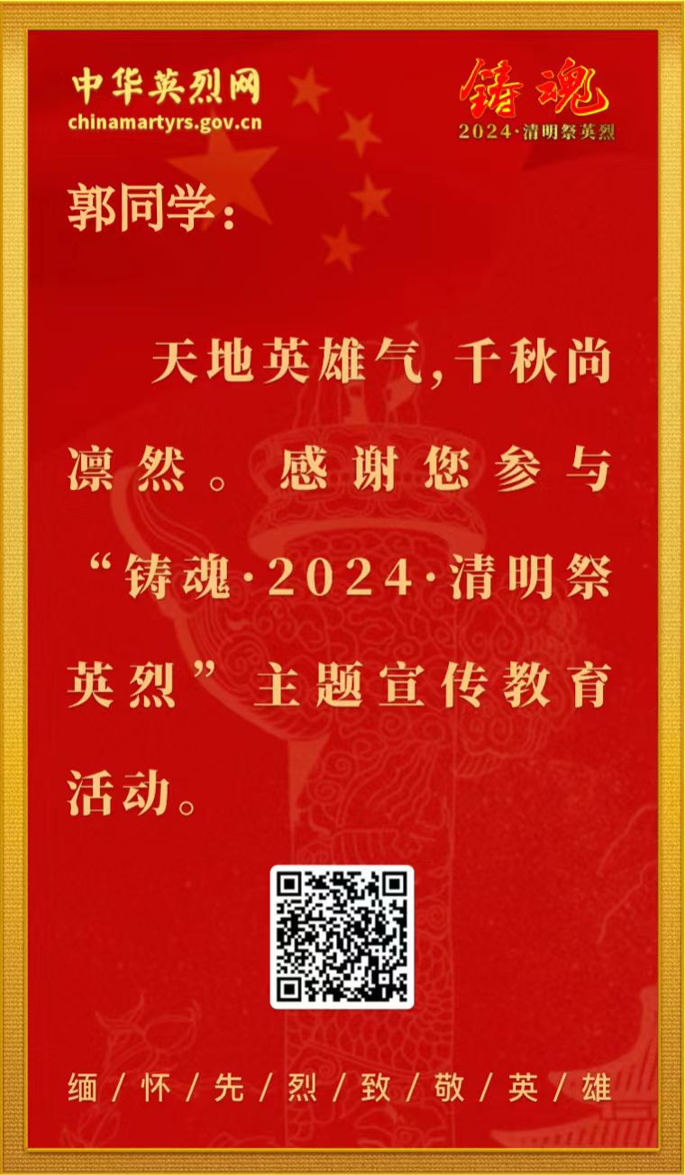 组织包括研究生和本科生在内的党员、团员、学生骨干等44人在中华英烈网参与“铸魂·2024清明祭英烈”网上祭扫活动。同学们在网上观看宣传片并向李大钊、邱少云、陈延年等烈士敬献花篮、鞠躬缅怀。
