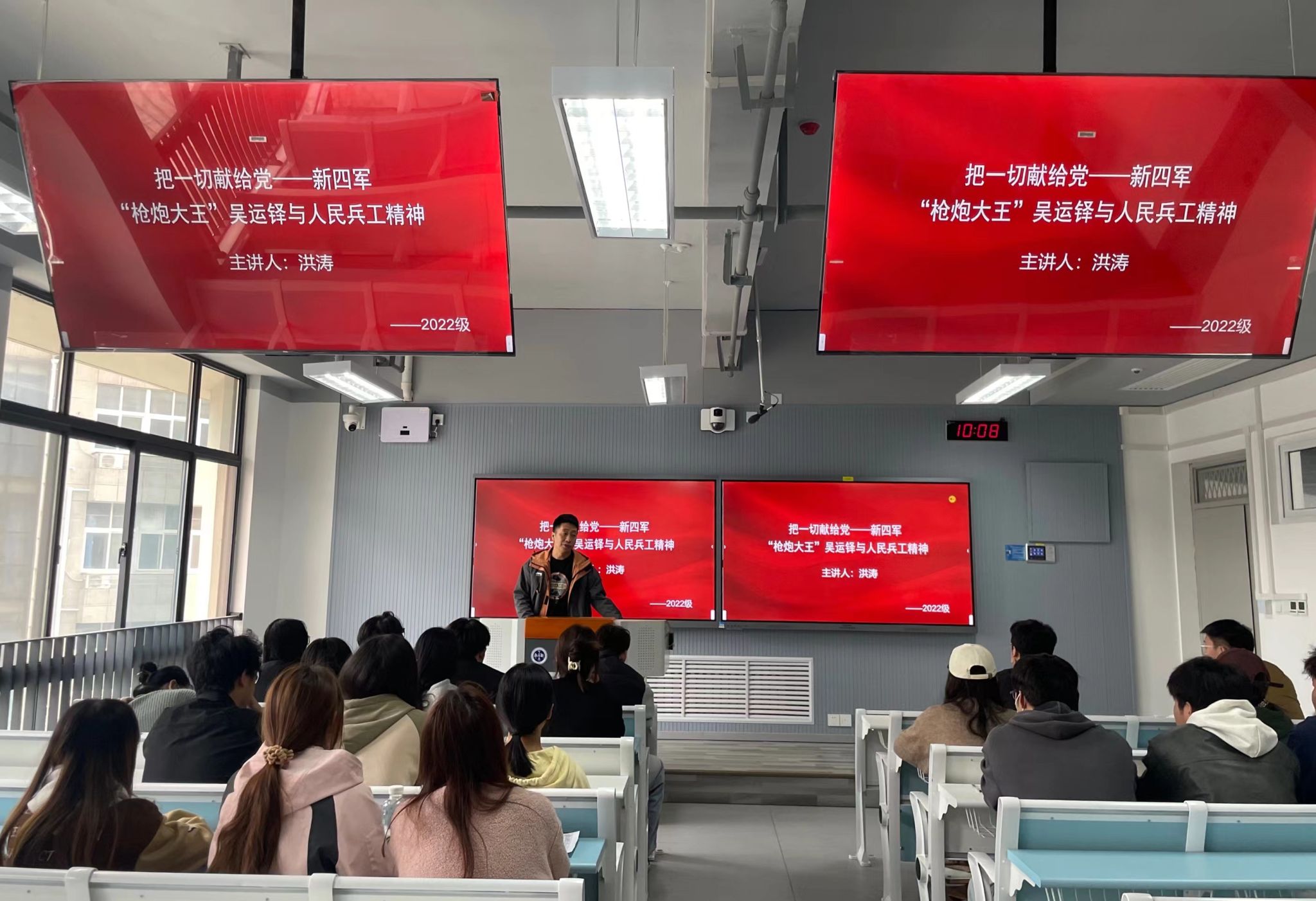 以年级为单位组织本科生开展专题学习。2022级辅导员洪涛以“把一切献给党——新四军‘枪炮大王’吴运铎与人民兵工精神”为主题为同学们做专题讲座;2021级辅导员黄怡梅以“缅怀革命先烈,赓续红色血脉”为主题带领同学们做专题学习。通过学习吴运铎的先进事迹,同学们再一次深入感受到“把一切献给党”的传统军工精神的内涵。