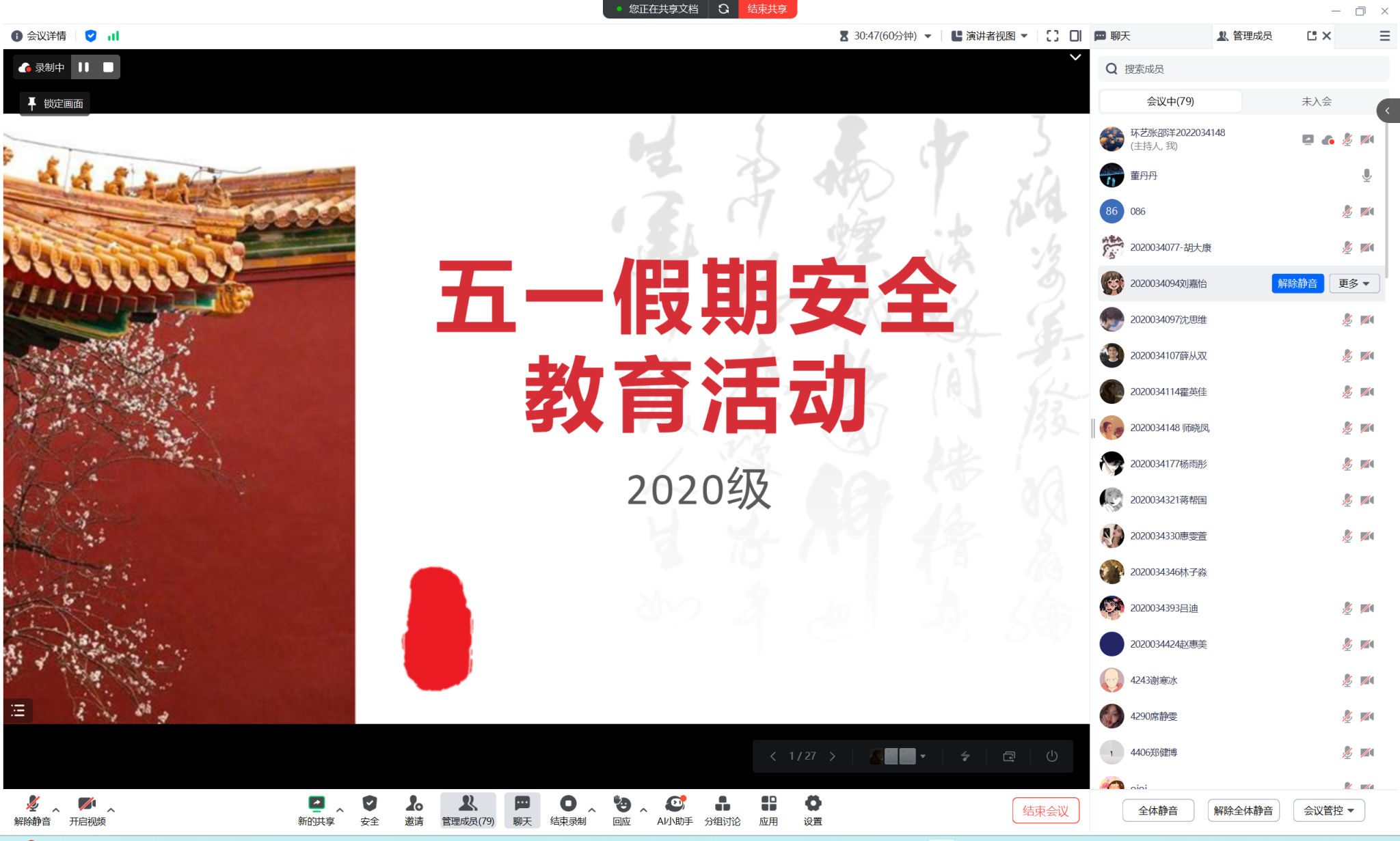五一假期将近,为进一步增强学生的安全意识,确保平安返校。4月30日,2020级开展五一假期安全教育主题班会,会议由辅导员董丹丹主持。