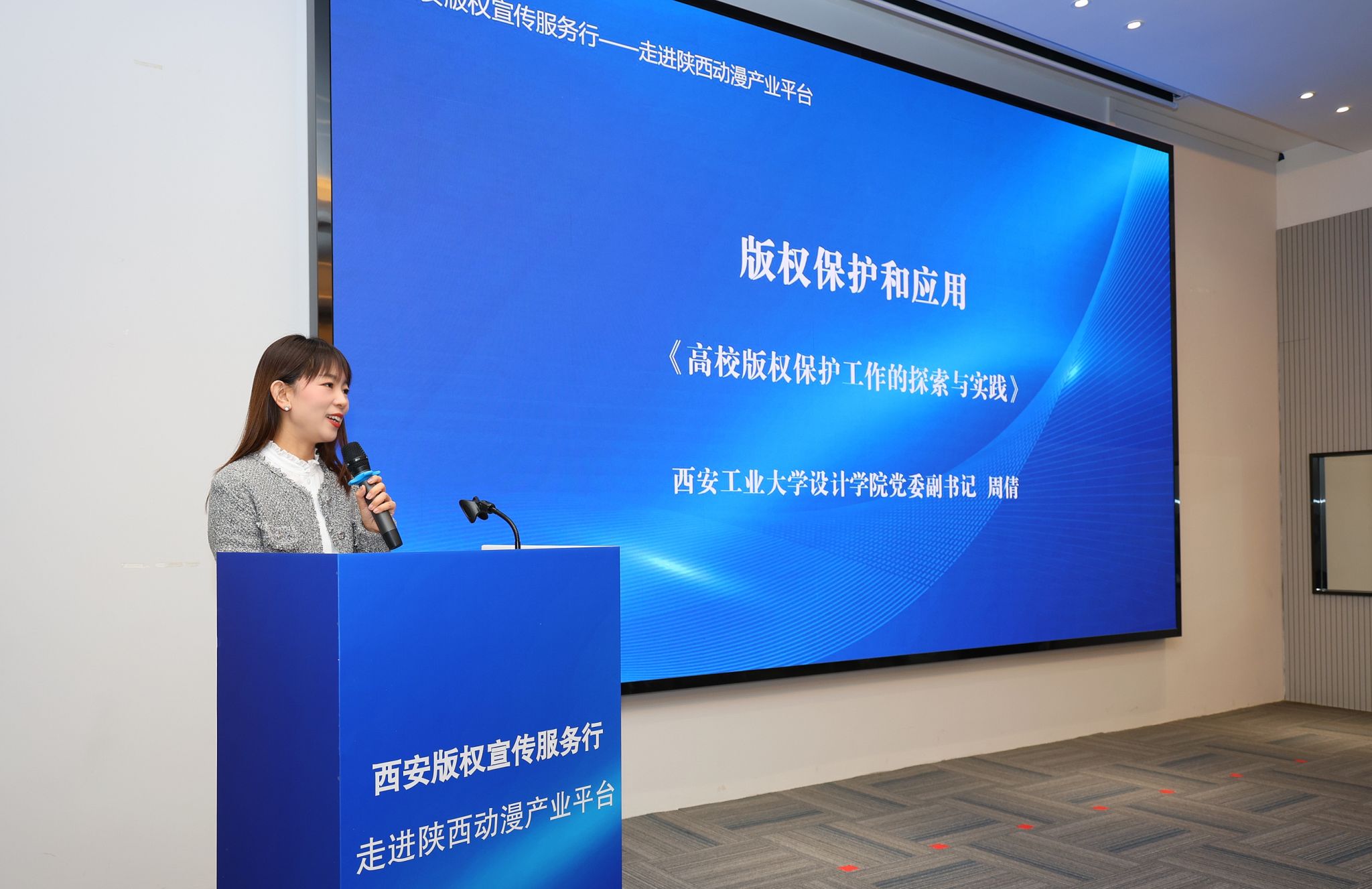“陕西动漫产业平台版权工作服务站校园服务点”,周倩作为版权工作校园服务点代表院校发言。