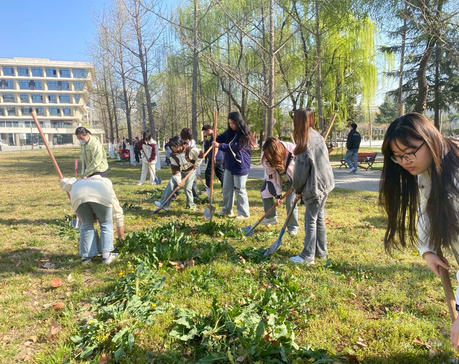 活动开始,志愿者们领取铁锹、手套等清洁工具,并迅速投入各自工作。为了提高工作效率,负责人将志愿者进行了分工,负责清扫主干道上的落叶与杂物;专注清理草坪中的垃圾,细心地将烟头、纸屑一一捡起;就草坪的杂草逐一进行清除。在同学们的不懈努力下,本次的清扫区域焕然一新。