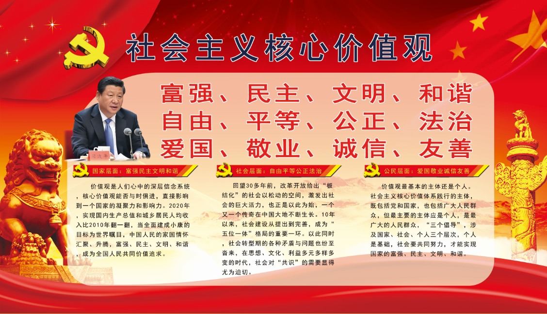 2013年12月23日新华社电中央办公厅印发《关于培育和践行社会主义核心价值观的意见》,从国家层面倡导富强、民主、文明、和谐;从社会层面倡导自由、平等、公正、法治;从公民层面倡导爱国、敬业、诚信、友善,形成了一整套成体系的价值观。这24个字反映的是国家目标、社会取向、个人准则,是中国特色社会主义的本质要求,是对中华文化优秀传统的继承,是整合社会力量、凝聚社会共识、解决和化解社会矛盾的重要思想工具。