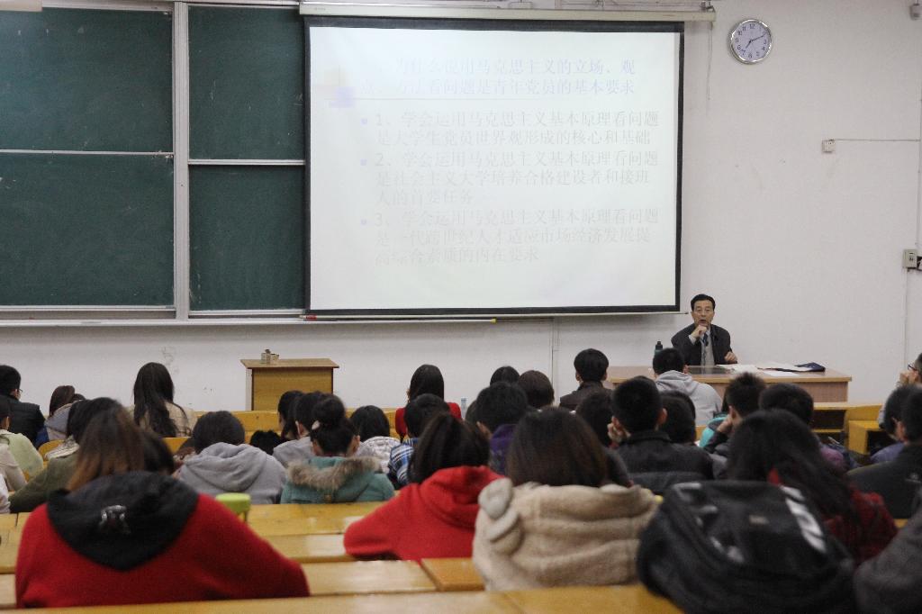 丁副书记首先以马克思主义的基本原理的立场、观点、方法结合多年工作实践,以一条理论与实践相结合,以一个个生动实例主线层次清晰的为大学生党员讲解了如何学习运用马克思主义,辩证发展的建立正确的“三观”,提高学生党员自身的政治素质、综合能力,着重强调了形势观察分析能力,辨别是非的能力,深刻理解掌握党的政策实质的能力,以及关键时刻党员的处事能力。其次告诉同学们在大学期间要树立正确的人生坐标,做好人生的规划。并提出具体要求:一要坚定信念——共产主义和中国特色社会主义的信念;二要把握两个环节——学习和实践;三要处理好工作和学习关系、建设者和观望者的关系、职业生活中人与人的三个关系。最后丁副书记指出,在学校期间,我们还是要把学习放在第一位,到毕业工作后要把工作放在第一位。