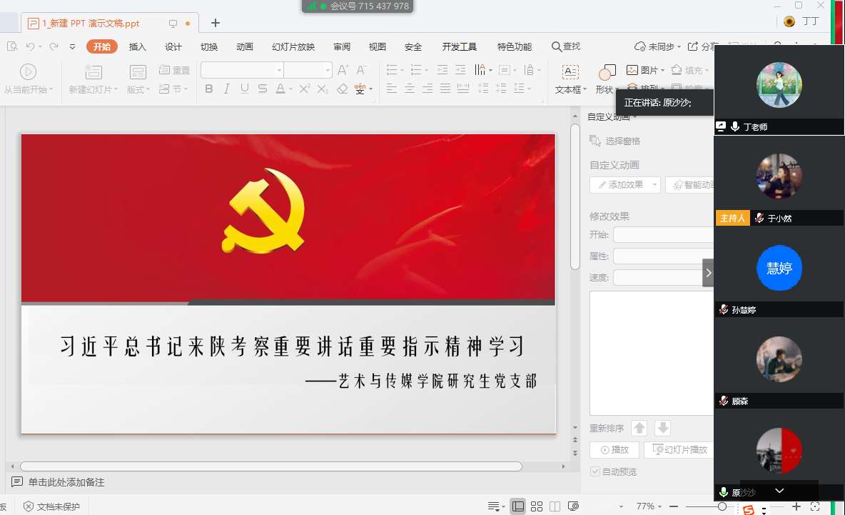研究生党支部在支部书记丁西蓓老师的带领下,通过视频会议的方式,学习“习近平总书记来陕考察重要讲话精神”和分享就业经验。