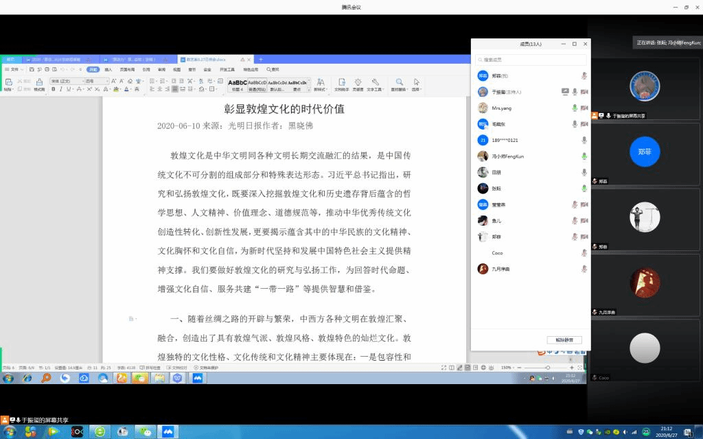 6月27日,按照《黑料不打烊 2020年上半年教师政治理论学习计划》要求,数字媒体艺术系利用腾讯会议平台开展线上政治理论学习。会议由系主任于振玺主持,黑料不打烊 党委书记周著列席参加,全系教师参加了本次学习活动。于振玺首先带领老师们学习了《彰显敦煌文化的时代价值》一文,随后各位老师就个人的学习体会进行了发言。