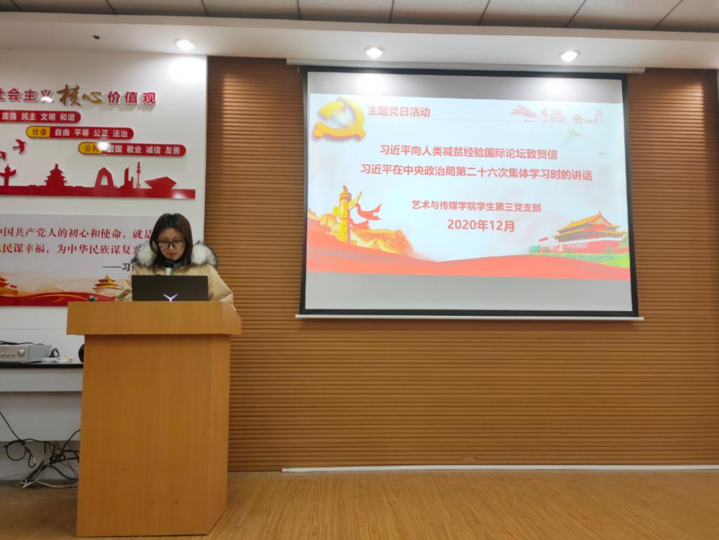 学生第三党支部组织学习《习近平总书记在中央政治局第二十六次集体学习时的讲话》和《习近平总书记向人类减贫经验国际论坛致贺信》,支部书记张晓宾主持,学生第三党支部全体学生党员参加会议。