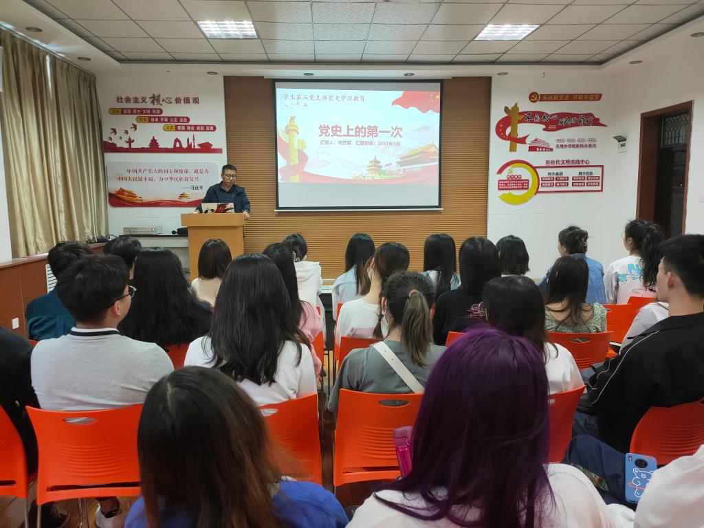 刘艺菲同志首先为大家介绍了党史上“第一个宣言《中国共产党宣言》”、“中共二大第一次提出反帝反封建的民主革命纲领”、“八一南昌起义是党领导打响武装反动派的第一枪”。接着,她向在座同志们讲述了相关党史“第一”的革命历程和主要功绩,让大学生党员切身体会建党的艰辛历程。