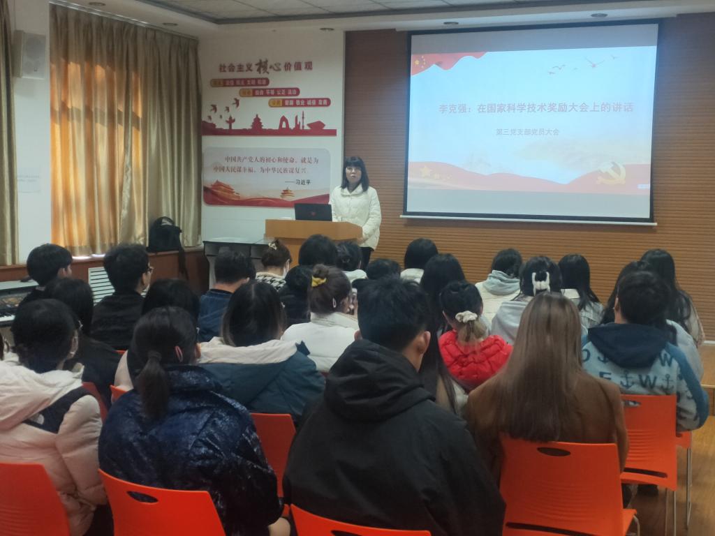 11月5日中午,学生第三党支部组织全体党员学习李克强在国家科学技术奖励大会上的讲话,会议由支部书记杨娜娜主持,全体党员参加会议。