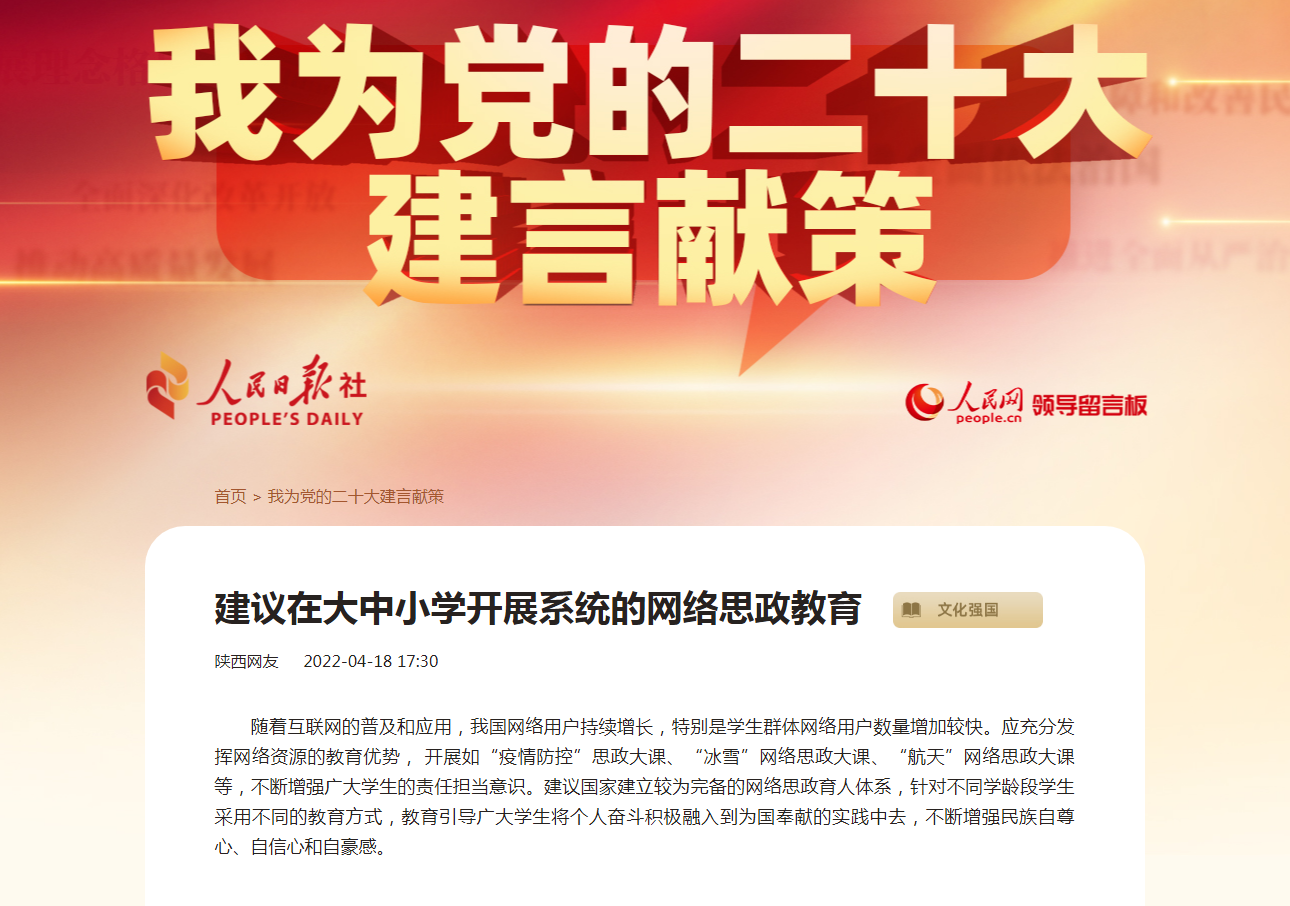 党委副书记张晓宾在文化强国方面建言:在大中小学开展系统的网络思政教育,充分发挥网络资源教育优势,开展网络思政大课,建立完备的网络思政育人体系。