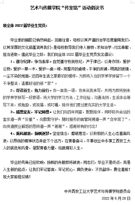 向2022届全体毕业生党员发出“传室铭”活动倡议,得到了全体毕业生党员的积极响应。