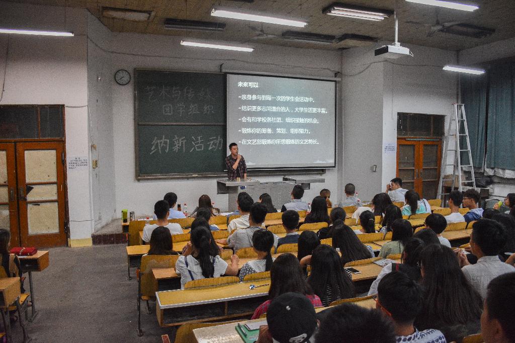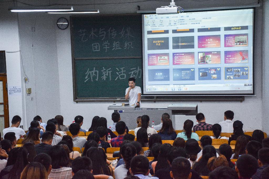 在4F-J1举行了学生会、艺术团的纳新大会。参加大会的有新生辅导员赵晋锐、团委副书记王嘉琪,团委各部门部长,学生会主席邹中林、副主席杨金瑶、杨金珂,学生会各部部长、副部长,大艺团团长、各部门部长及2016级新生。