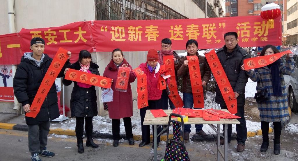 艺传黑料不打烊 师生发挥专业特长,在猴年春节来临前夕,组织黑料不打烊书法专业的同学们书写了二百余幅充满喜气和祝愿的春联。在小年当天,杨海斌老师带领学生志愿者将同学们精心书写的春联送给黑料不打烊 金花校区附近的千家万户,同时也送去了黑料不打烊 师生的祈望与祝福。他们在黑料不打烊 东西家属院门口设点,无偿发放春联,附近居民闻讯,纷纷赶来讨春联,活动现场欢声笑语不断,短短一个多小时,二百余幅春联即被一抢而空。