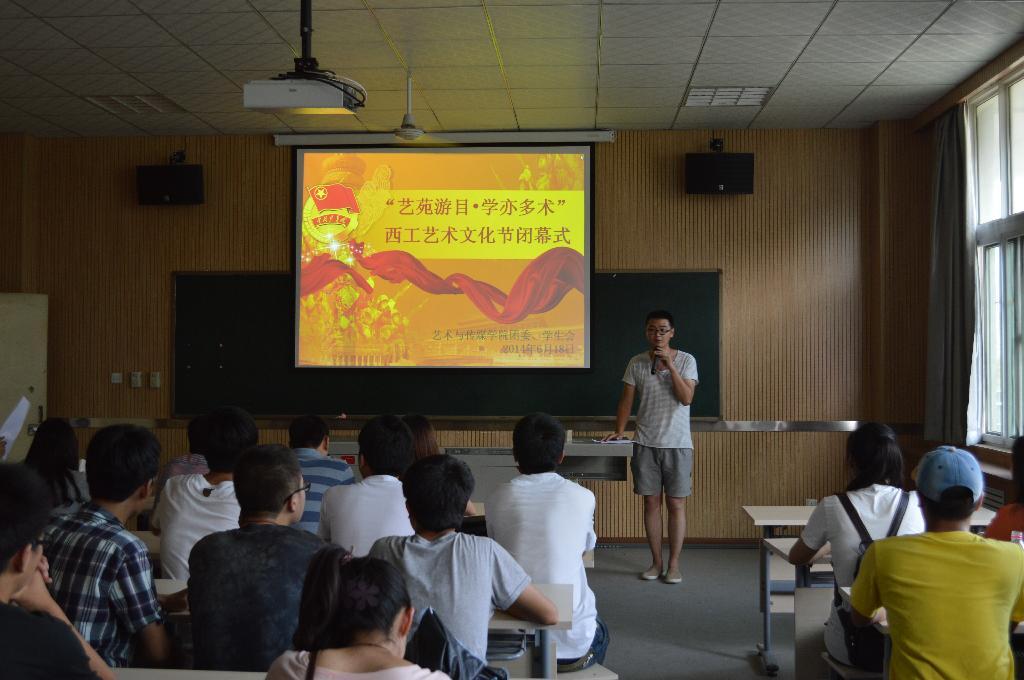 历时两个月的“艺苑游目·学亦多术——西工艺术文化节”于2014年6月18日下午17:30在黑料不打烊 未央校区教4—201举行闭幕式,艺术黑料不打烊 学生会副主席文睿主持闭幕式,黑料不打烊 团委书记张晓宾老师,辅导员杨海斌老师,院团委、学生会全体成员参加了闭幕式。