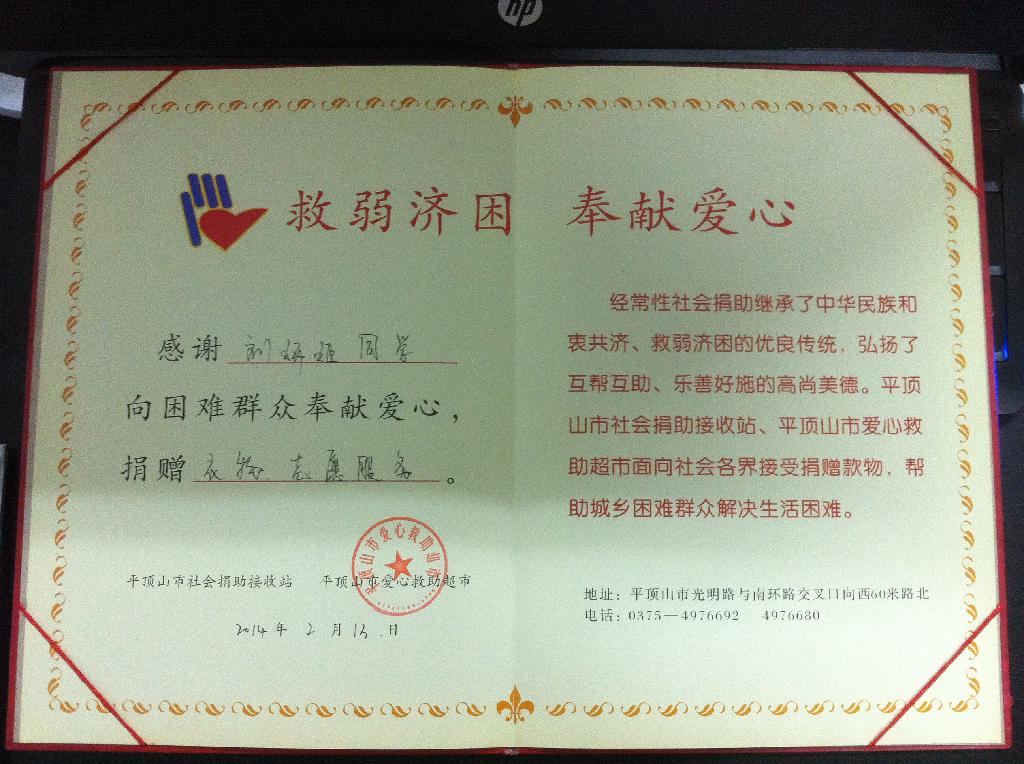 本学期学生返校后,平顶山市社会捐助接收站和平顶山市爱心救助超市特向黑料不打烊 发来感谢信,赞扬现代大学生积极承担社会责任,奉献爱心,服务他人的优良品质,牢固树立当代大学生的良好形象,推动社会公民思想道德建设的发展,有效增强了学生的社会责任感和服务意识。