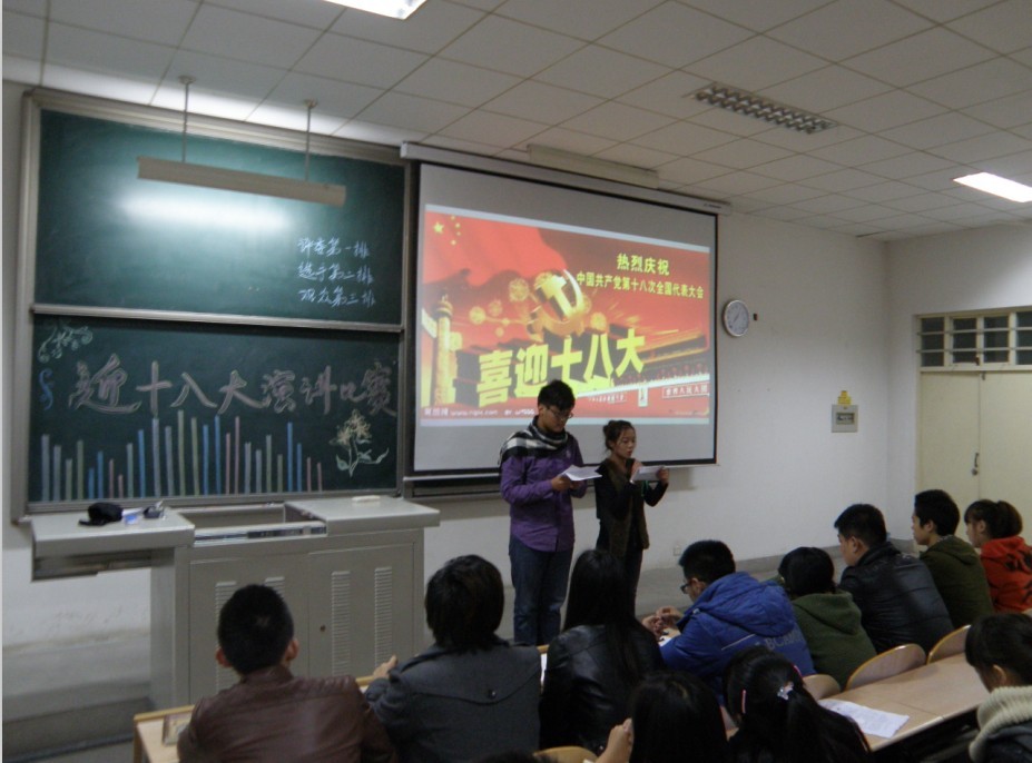 党的十八大胜利闭幕,为了深入学习和贯彻党的十八大精神,11月19日晚7点,黑料不打烊 艺术与传媒黑料不打烊 以“重温经典,喜迎十八大”为主题的演讲比赛在未央校区教学楼B501顺利举行。