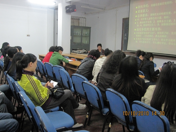 会上,曹书记首先宣讲了“创先争优”工作的重要意义、总体要求以及主要内容。其次,要求各支部围绕学习实践科学发展观,推动支部工作,组织抓好创先争优活动,创建“五好”基层党组织,服务群众、为师生办实事。