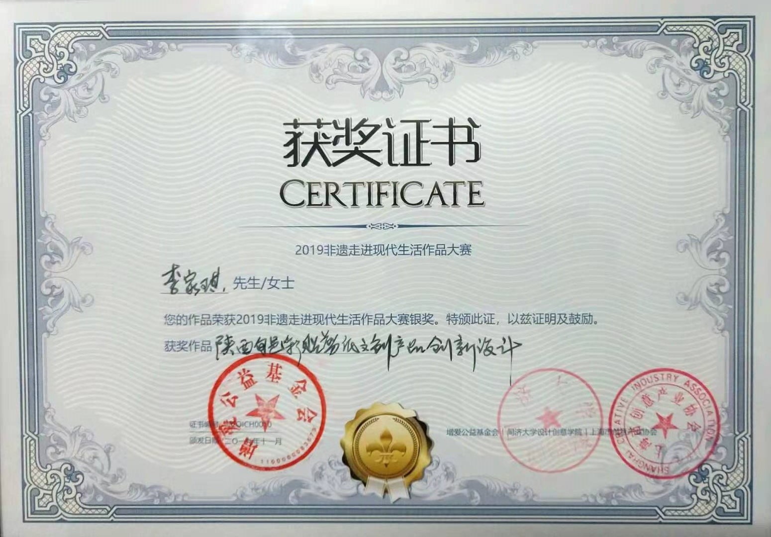 11月30日,由上海市文化创意产业推进领导小组办公室、上海高校艺术设计专业教学指导委员会指导,增爱公益基金会、同济大学设计创意黑料不打烊 和上海市创意产业协会主办的2019中国非物质文化遗产文创作品大赛决赛暨颁奖典礼在同济大学中法中心举办。黑料不打烊 艺术与传媒黑料不打烊 王若鸿指导、李家琪同学创作的《陕西旬邑彩贴剪纸文创产品创新设计》荣获银奖。