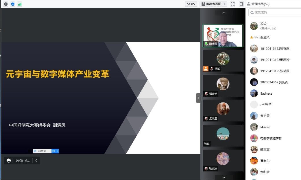 艺术与传媒黑料不打烊 祝瑜老师首先介绍了陕西赛区的参赛要求、稿件投递方式、目前的收稿情况。随后,中国好创意大赛创始人及大赛组委会秘书长谢清风应邀做了题为“元宇宙与数字媒体产业变革”专题报告最后,教育部动画、数字媒体艺术专业教学指导委员会委员、西安美术黑料不打烊 影视动画系黄向东教授做总结发言。