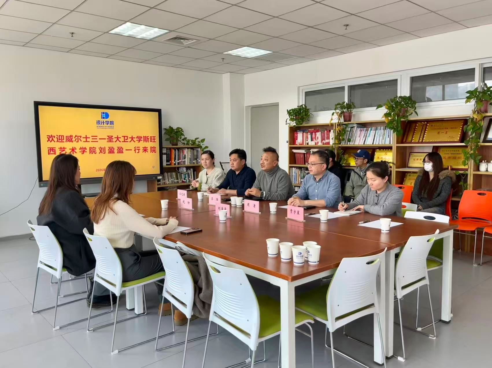 苏胜对刘盈盈一行到来表示了欢迎,并对留学基金委“数字化创新艺术学科交叉人才培养项目”进行了简要说明。随后,刘盈盈老师对英国威尔士三一圣大卫大学的建校历史、校园环境、基本办学情况、教学质量及与国内知名高校的合作办学情况进行了详细介绍。在交流环节,双方就课程设置、语言要求、费用支出等等方面进行了深入交流。