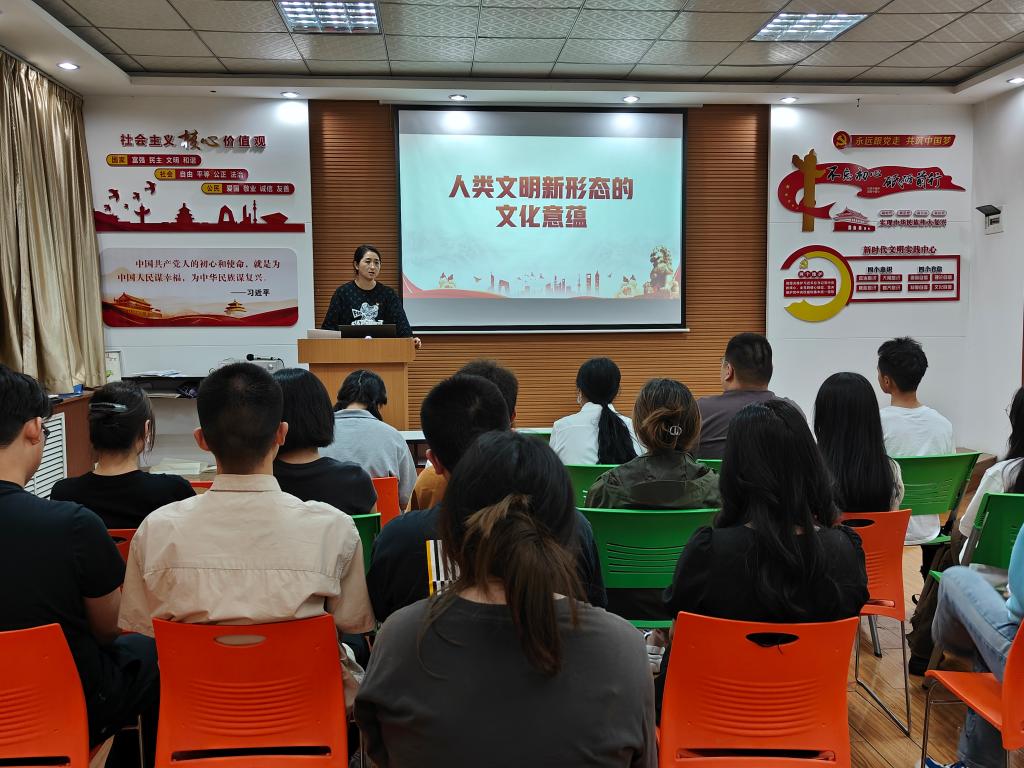 学生第一党支部书记孙雅茹以“人类文明新形态的文化意蕴”为主题讲授党课,支部全体党员参加。