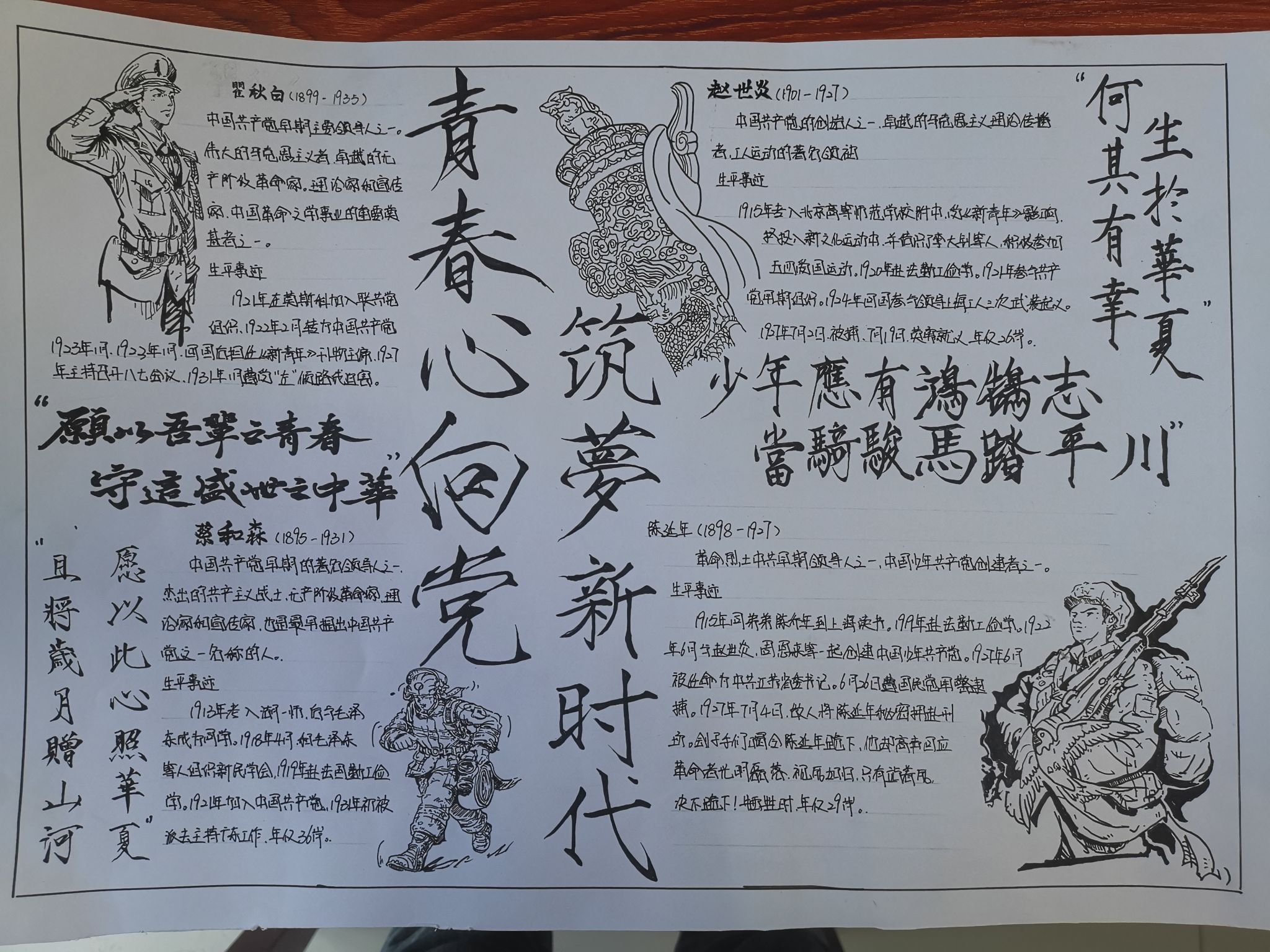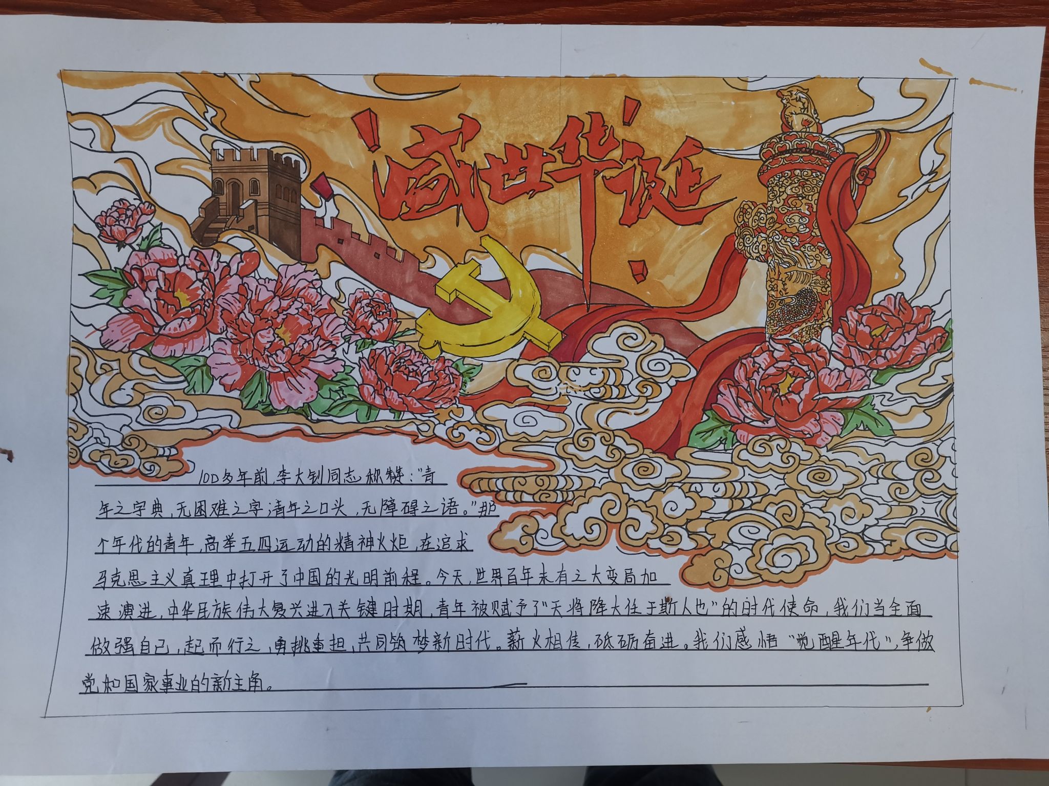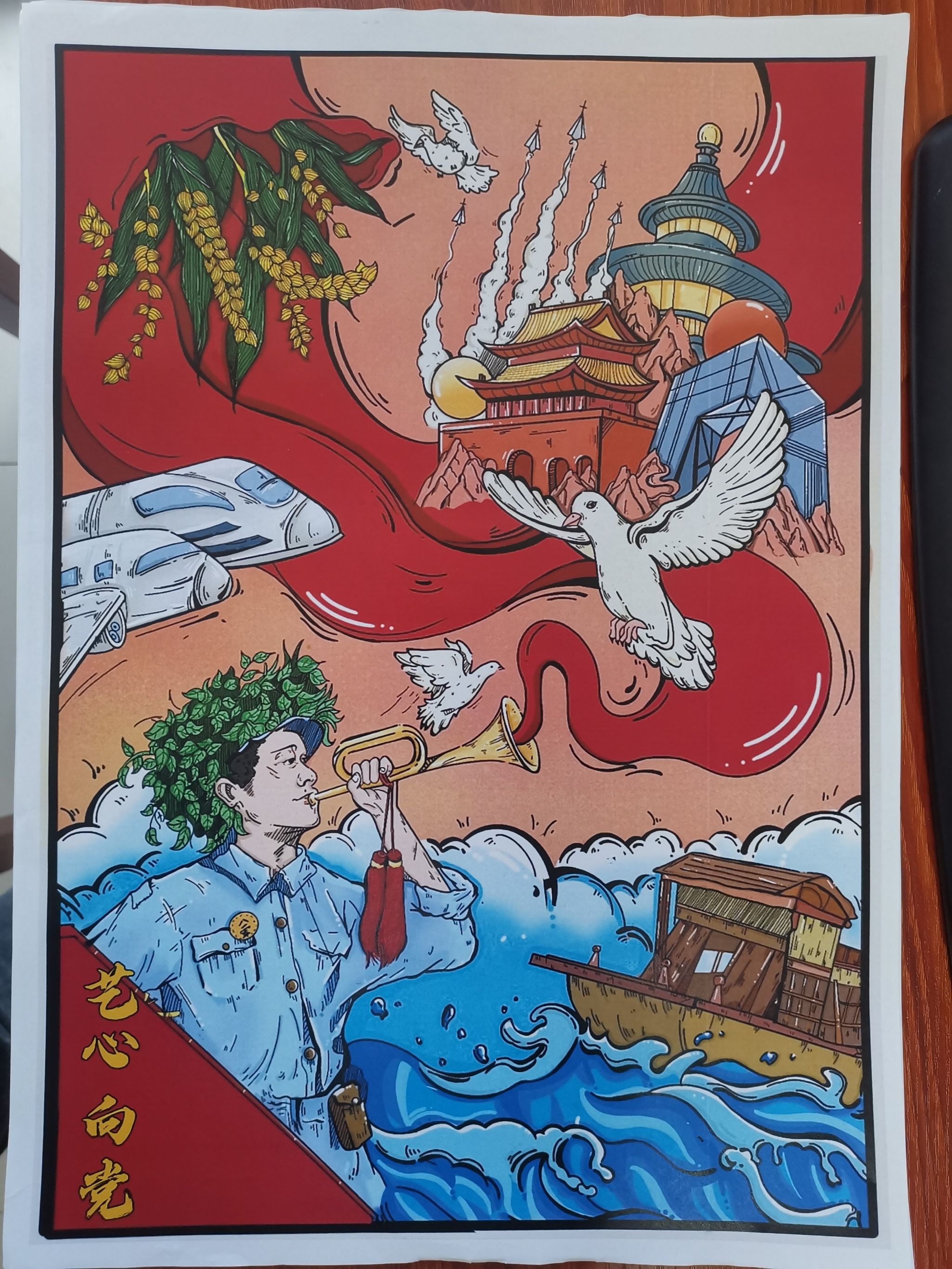 专业特色,发挥专业特长,以图文并茂的方式呈现党的伟大历程、革命先烈的光辉一生和当代青年的使命担当,通过书写、绘画加深对党史的学习和认识,自觉肩负起时代赋予青年人的使命和担当,在青春奋斗中书写无愧于时代的精彩华章。