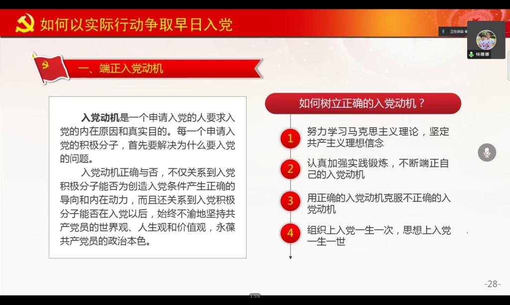 杨娜娜讲述了党的基本性质和根本宗旨、共产党员的权力和义务、成为共产党员的条件和程序,如何以实际行动争取早日加入中国共产党四个方面内容。杨娜娜要求大家在实际学习和工作中,要端正入党动机,加强政治理论学习,从身边点滴做起,争取早日加入中国共产党。