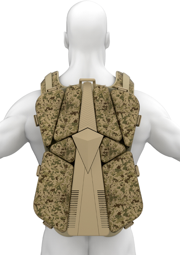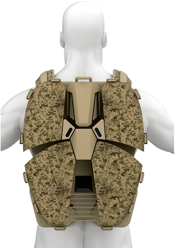 本文分别从军用背包背负和存储两个系统提炼主要的需求目标,并寻找能够与之形成相似性的生物特性。背负系统:主支撑骨架和部分辅助支撑的结合将参照蛇亚目的脊柱与肋骨,以及肌肉之间的结构体系来进行完善;存储系统:主要借鉴蛇头部和腹部鳞片分布进行功能的分配和造型提取,实践中背负系统将外架包与内架包的特点相融合,采用框架形式结合,外架框避免了背部与背包的直接接触,通风性和稳定性更佳;在贴近人体背部的部位,背负与腰带、肩带采用“S”形的设计,既可调整重心也可合理分负重力;这种外挂式的背负系统可以实现一种背负系统搭配不同的作战模块,满足不同的作战单元和需求,这种设计理念更符合课题提出的模块化存储的需求。