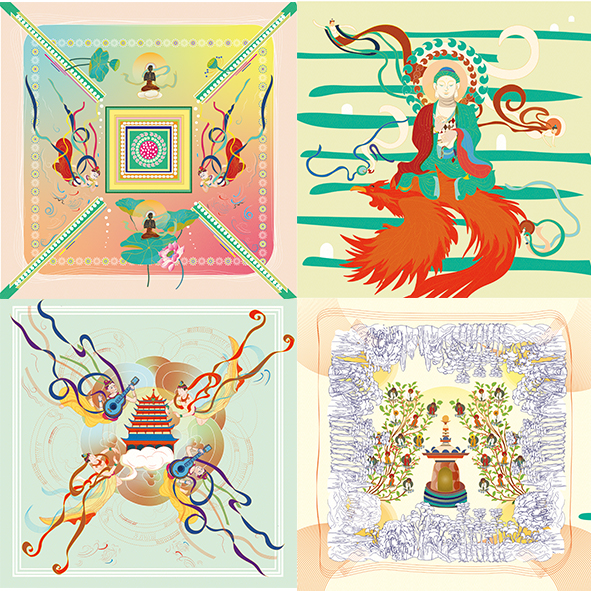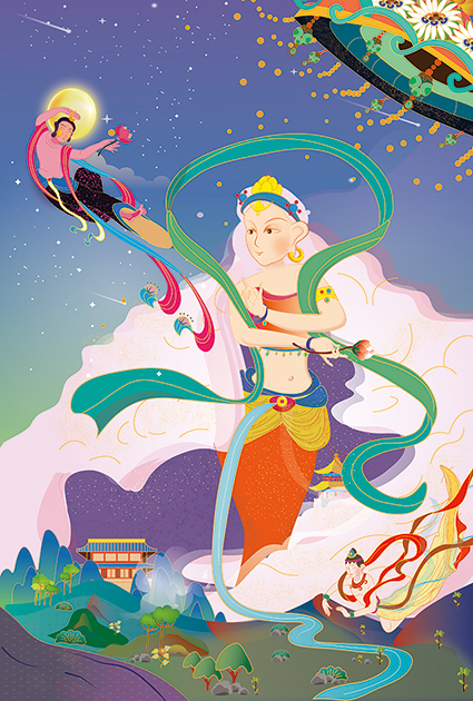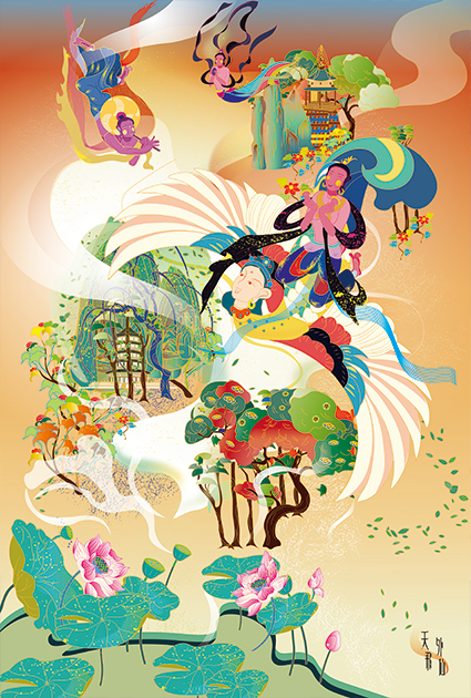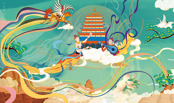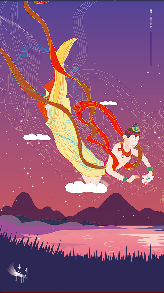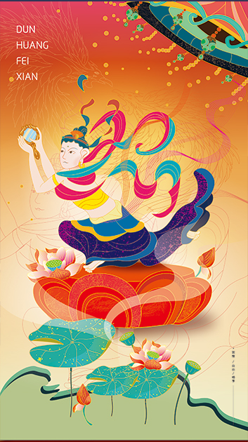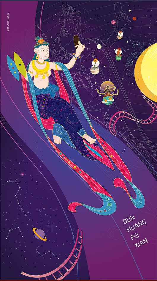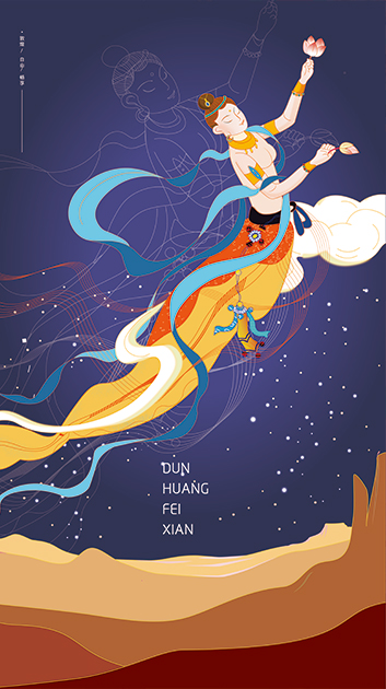 设计主要以唐代敦煌飞天的造型形象为中心,将其造型特点、构图方式、色彩表现与现代审美相结合,归纳提炼出具有代表性的飞天造型元素及辅助图形。立足于当代设计理念,将飞天元素与敦煌舞、现代插画、动画风格等结合,设计出古今呼应的插画与海报。力求将现代感与历史文化以浪漫的方式相互交融,­­­以形写神,设计出具有多重美感,彰显飞天生命力的作品。