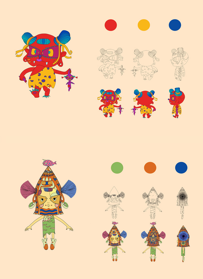 通过现代插画艺术风格进行角色、场景衍生开发设计和应用,半坡角色的衍生开发,是一种“再设计”,是对文化的重新审视、理解文化背景、融合半坡文化元素中蕴含的思想情感结合现代艺术风格,在半坡角色衍生设计一开始对于要呈现的角色形象是没有完整的概念的,很多灵感都是在草稿绘制过程中产生的,所以创作过程会不断地突破,不断地发现惊喜,改良新的角色。角色的衍生开发设计借鉴了中国传统民族文化与绘画风格,将归纳出的造型符号赋予角色。角色形象是依据原始生活中的社会分工等绘制,优化处理线条的细节,让其符合现代的审美标准,角色更加充实和有趣,具有半坡特色。半坡衍生场景以女巫为视觉中心,以水为祈福具体形式表现,连接各点组成捕鱼、祈福、狩猎、农耕等长卷绘制。根据移动媒体的流行趋势,确定画幅的长宽比以手机屏幕为主,显示比例是16:9。内容上从左往右分别是捕鱼、祈福、狩猎、农耕四个部分整体场景是一个完整首尾可拼合的整体,一方面能将整体角色更好的展现出来,另一方面传达敬畏自然与自然的和谐相处的思想观念。多样化展示了史前文化的魅力,能让更多人了解不一样的半坡文化。